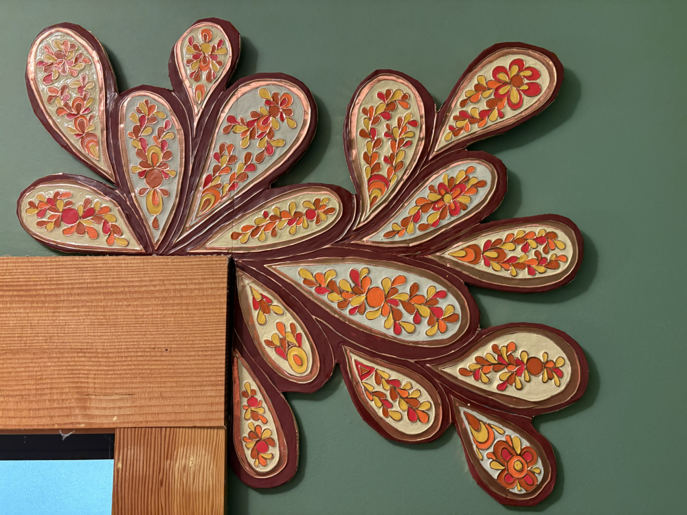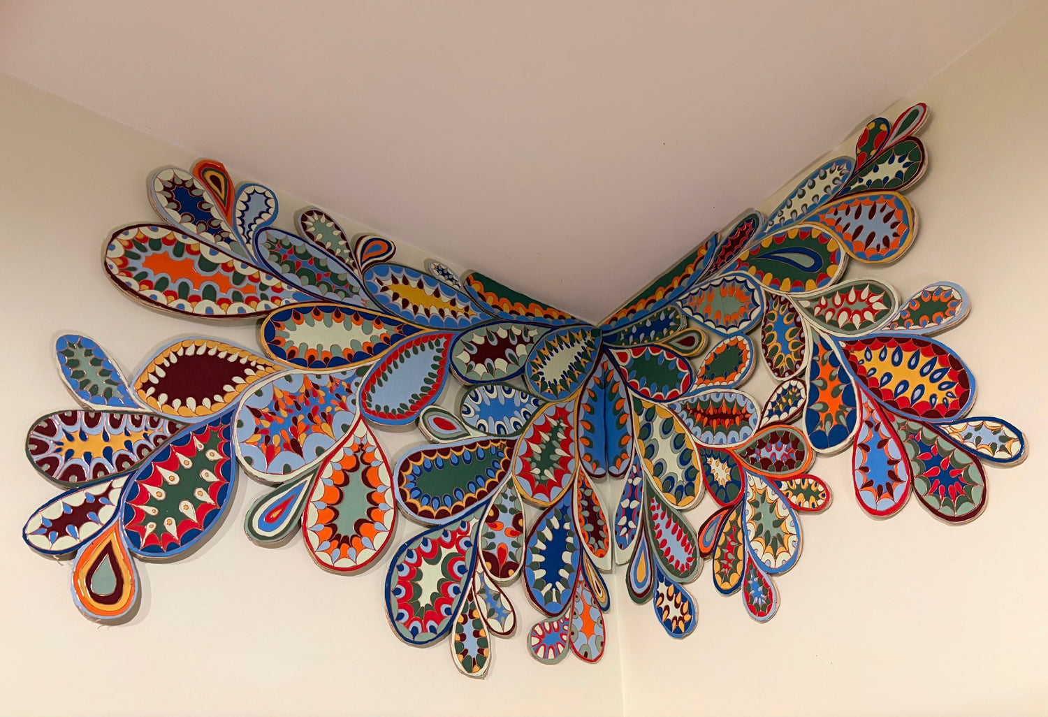 My artistic aesthetic is an abstract exploration of patterns, celebration of color, and experimentations with the luminosity of metal. Working with copper sheet as a canvas, the metal is modified through the metal working process of embossing and fold-forming. Painted color is added to the formed shapes, which emphasizes the 3-D relief and creates additional patterning through color. Curved and circular shapes and patterns, bright colors, multiple non-square canvases that interact with the installation space are all part of the composition and intent – to visually capture feelings and emotions of happiness, joy and wonder. Many of my artworks are a series of two or three artworks that are modular in nature and frequently designed for specific placement adjacent to corners or doorframes to soften and bring interest to the hard angles of our built environment.