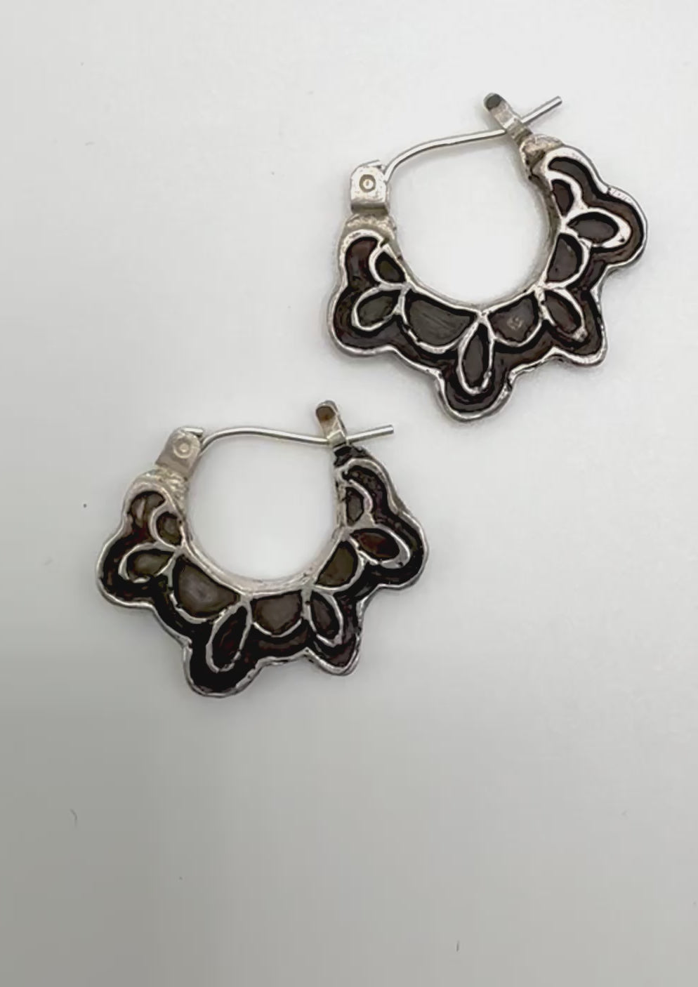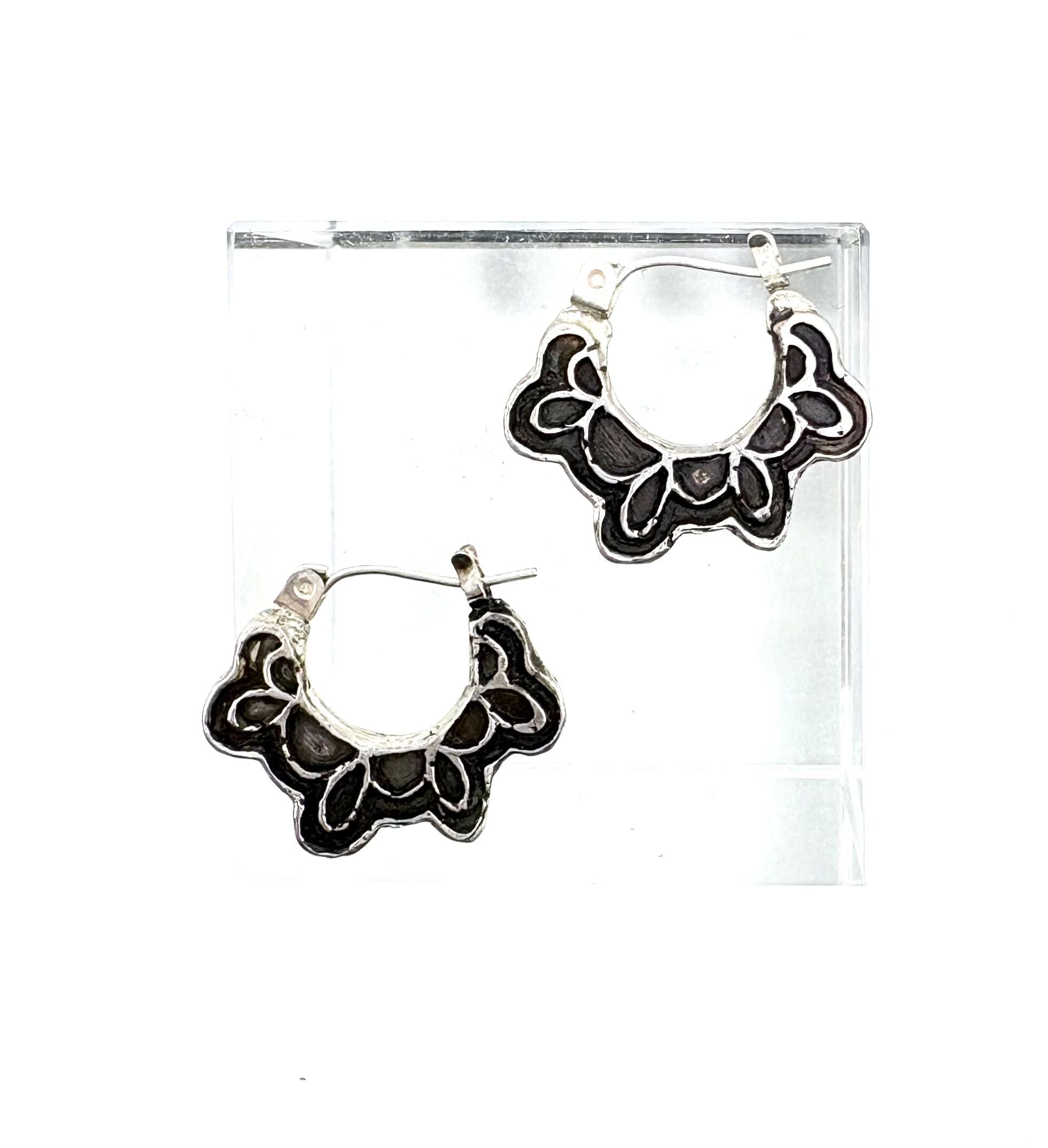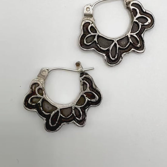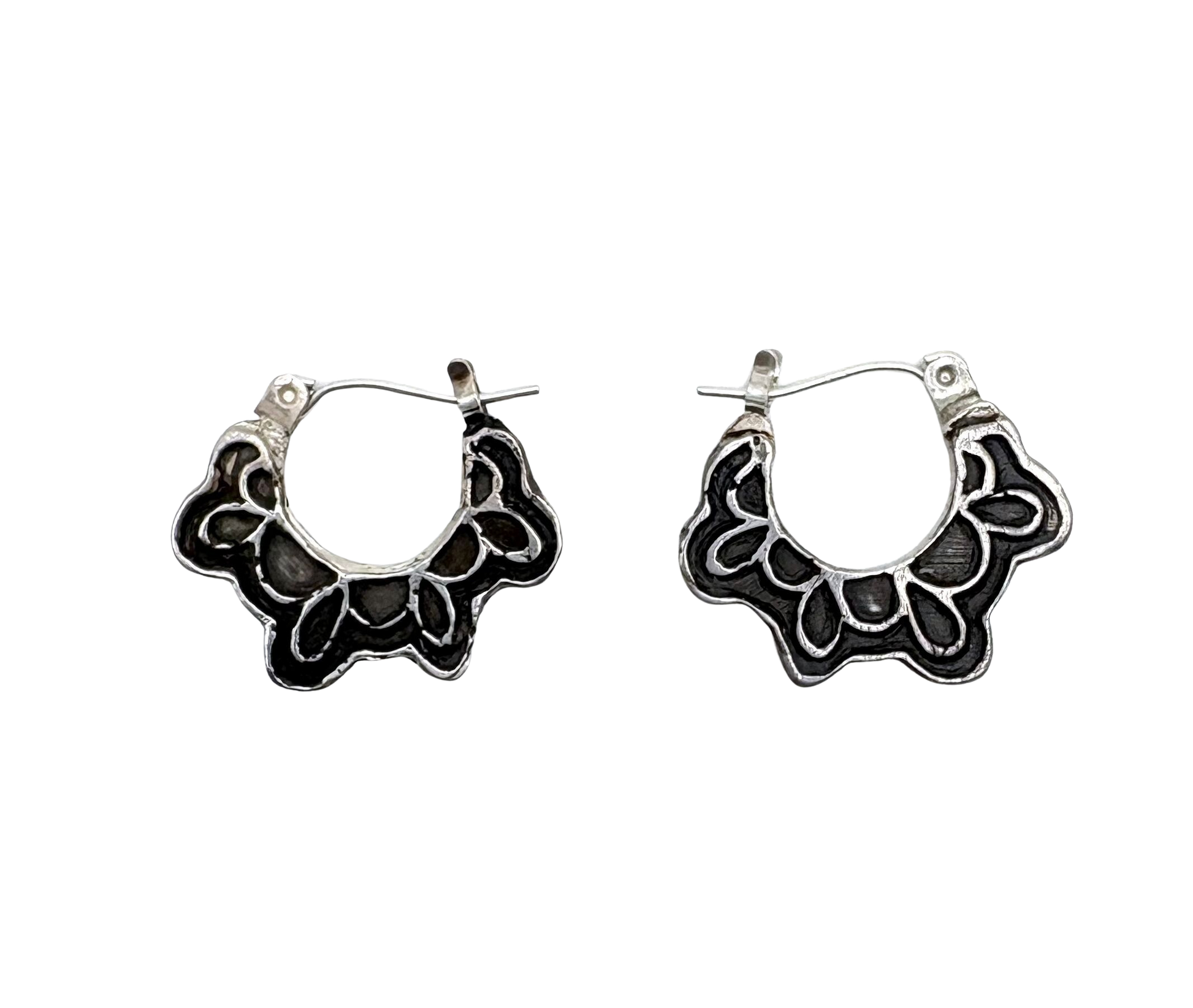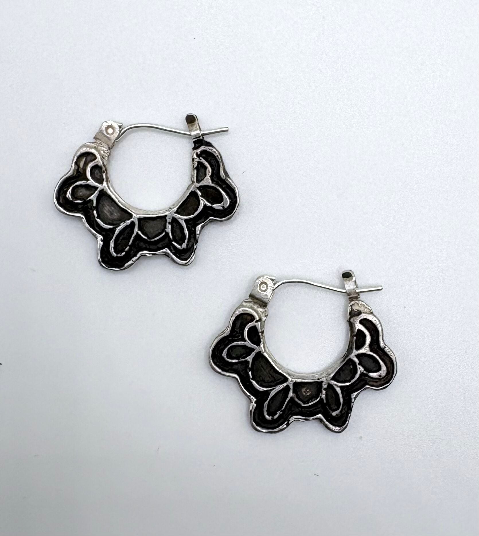 Hand carved in wax and cast in sterling silver, these hoops feature a swing post and have a blackened patina surface. Fit close to the lobe and very comfortable to wear.