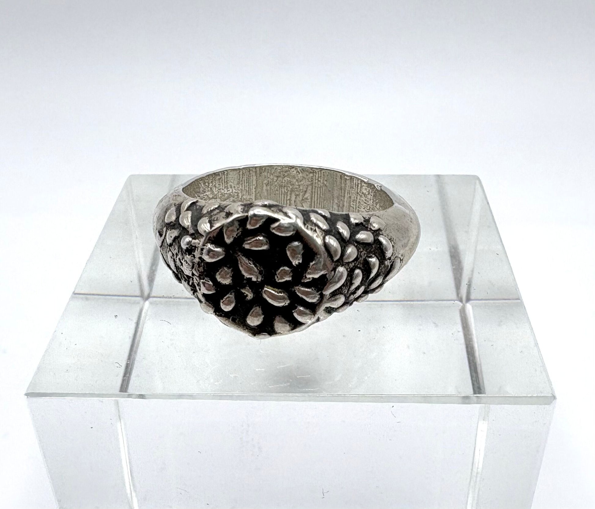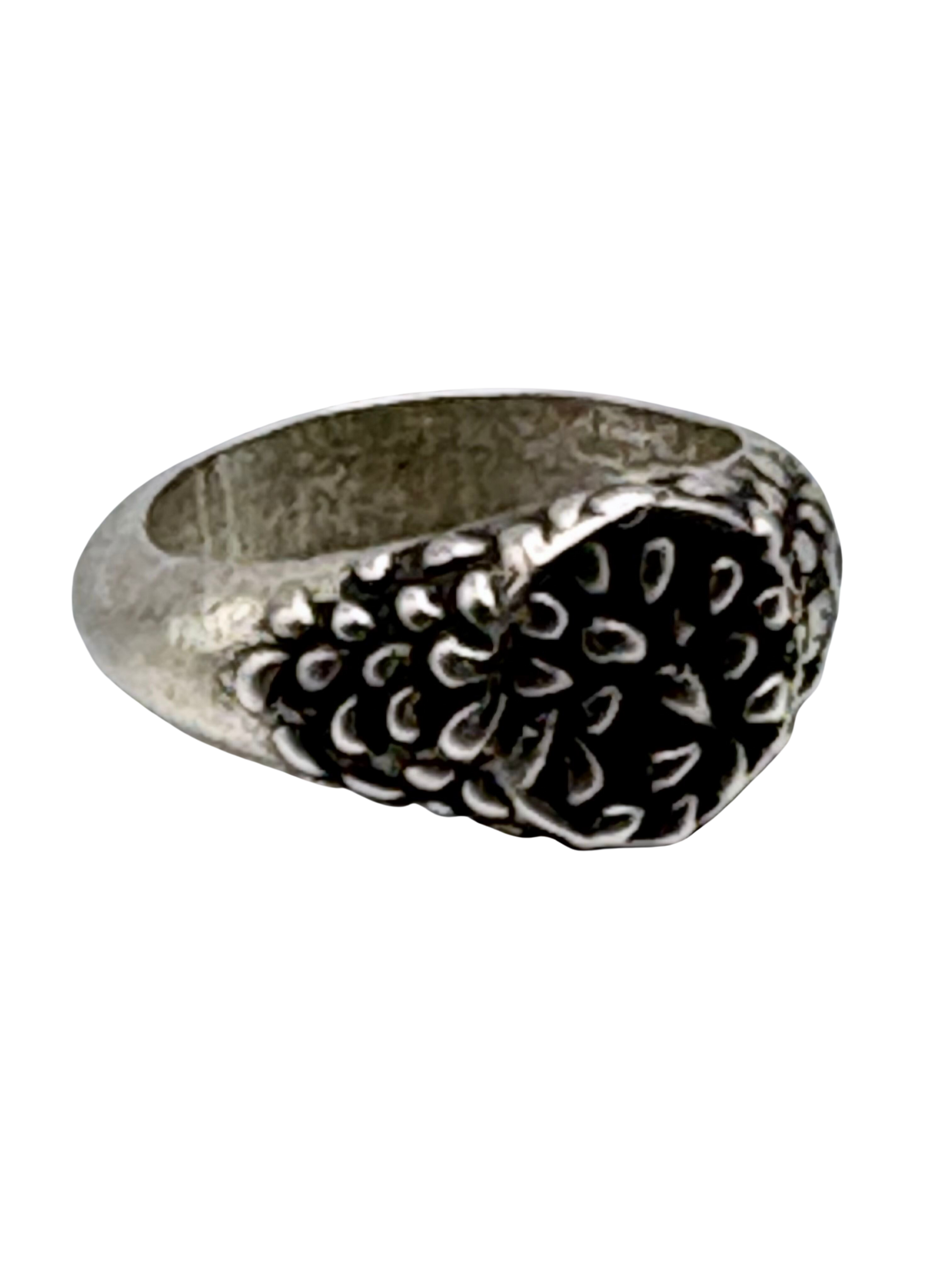 Textural organic leaf patterns cover the surface of the size 7.25-7.5 signet ring. Substantial weight due to the solid silver construction. Hand carved in wax and cast in silver, finished with a blackened patina and polished to allow the texture to shine.