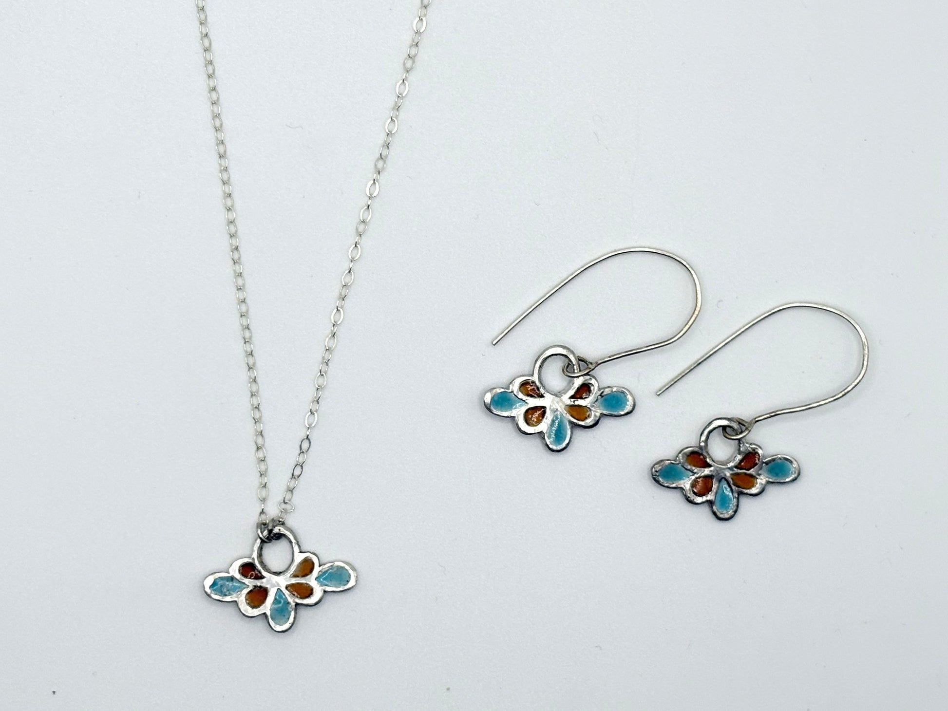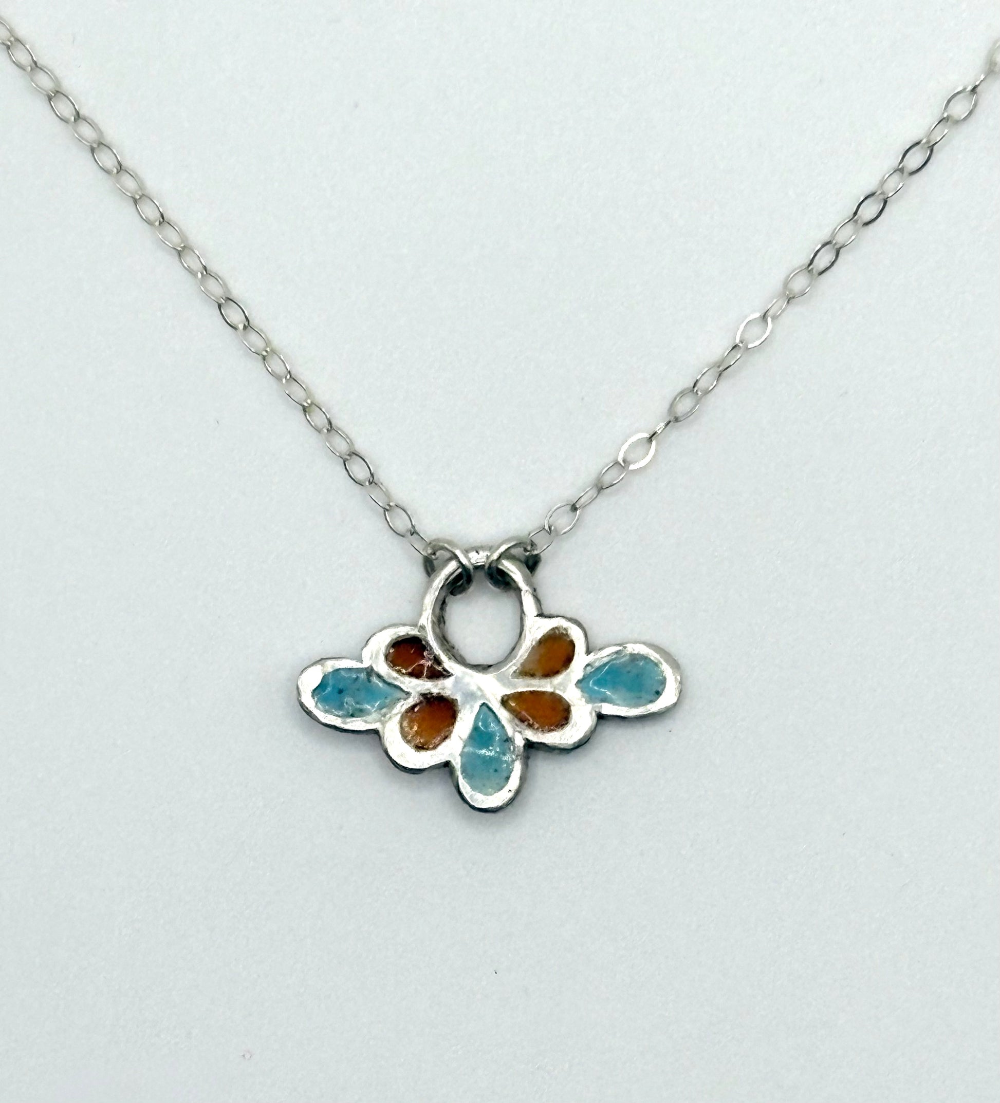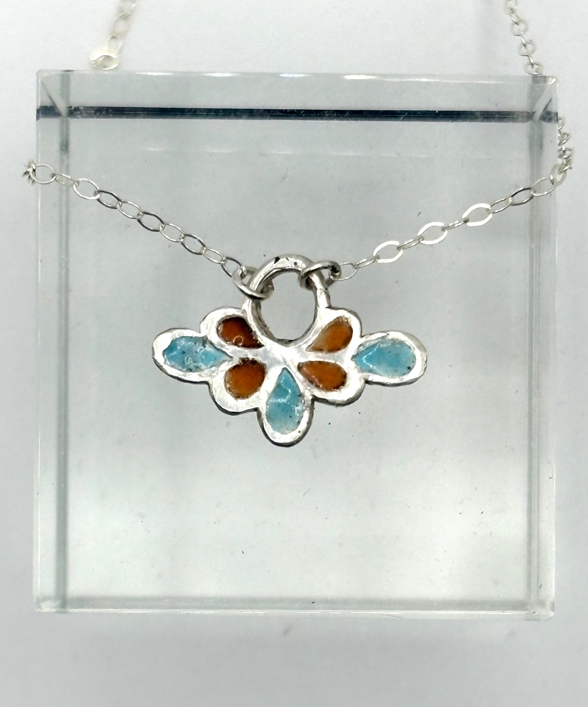 This delicate pendant is a one-of-a-kind vitreous enamel inlay within the recesses of a custom cast silver shape. Turquoise, deep orange and silver. 16" Sterling chain and a lobster clasp.